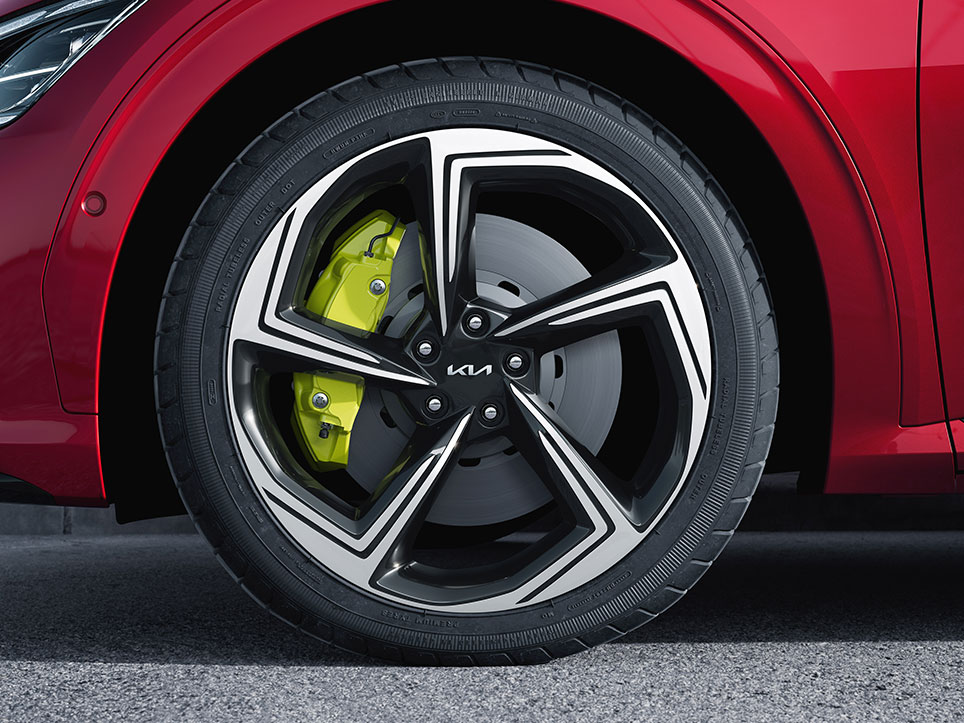 Charakteristisch für das Design des EV6 GT sind die speziellen 21-Zoll-Leichtmetallfelgen, die mit ihrem detailreichen, sportlich inspirierten Look für noch mehr visuelle Präsenz sorgen. Ergänzt werden sie durch neonfarbene Bremssättel, die perfekt zu den eleganten Neon-Akzenten im Innenraum passen.